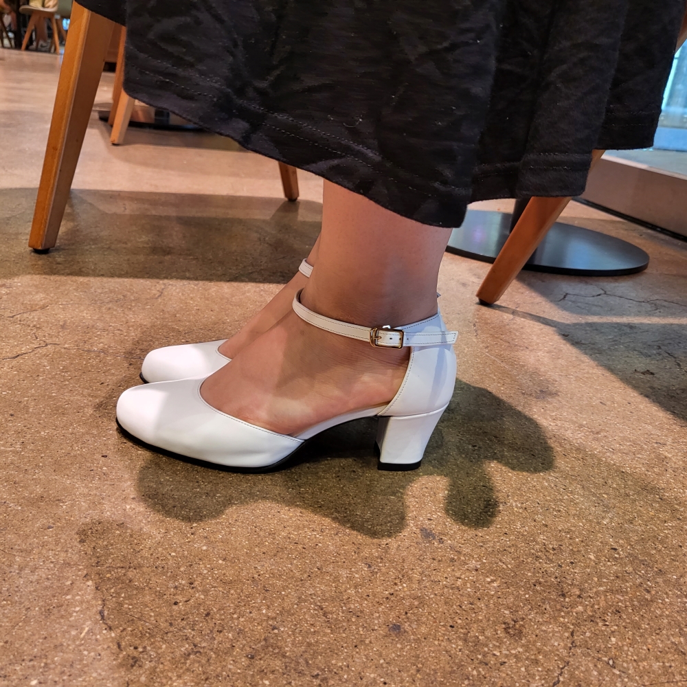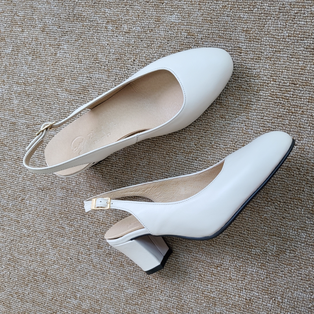 작구요 스퀘어 하프 큐빅 소가죽 흰색 펌프스 5cm