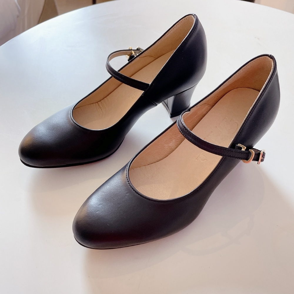 작구요 소가죽 검정 스트랩 인스퀘어 펌프스 힐 5cm