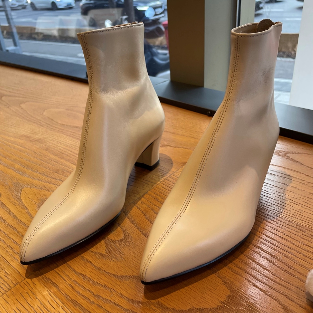 작구요 모카베이지 양가죽 뾰족코 하이 앵클부츠 3cm