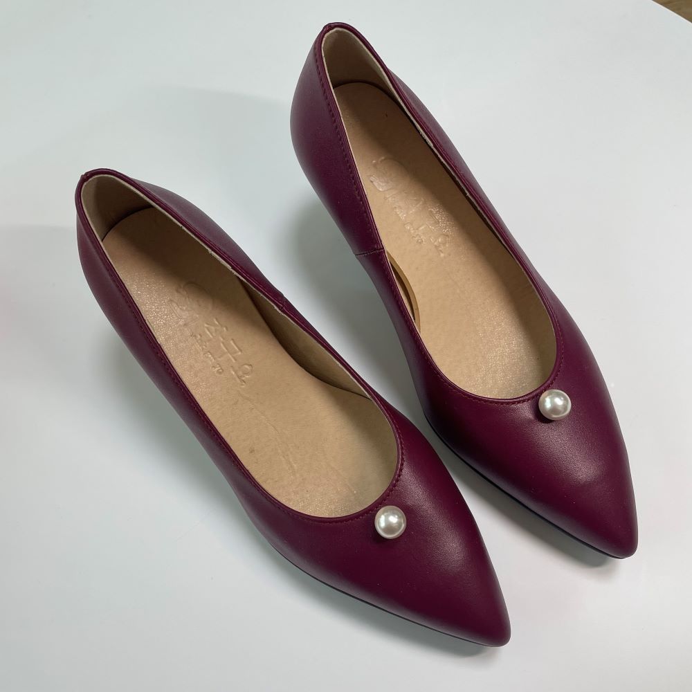 작구요 소가죽 버건디 뾰족코 진주장식 펌프스 5cm