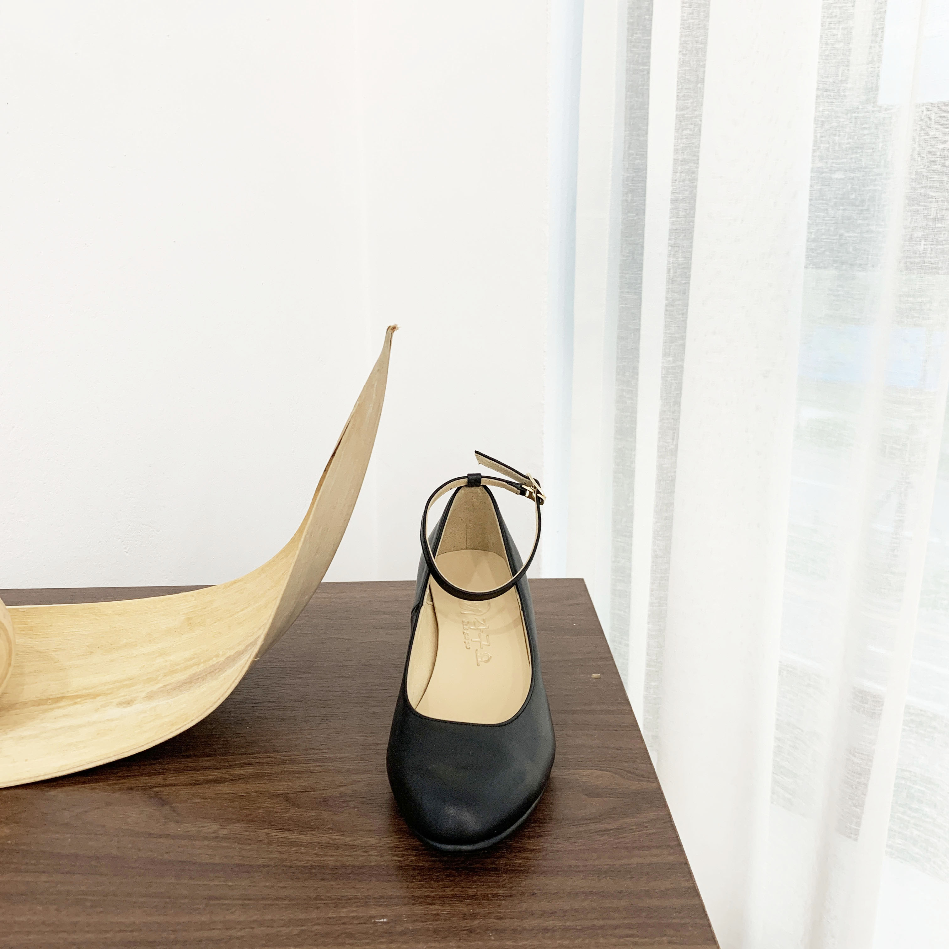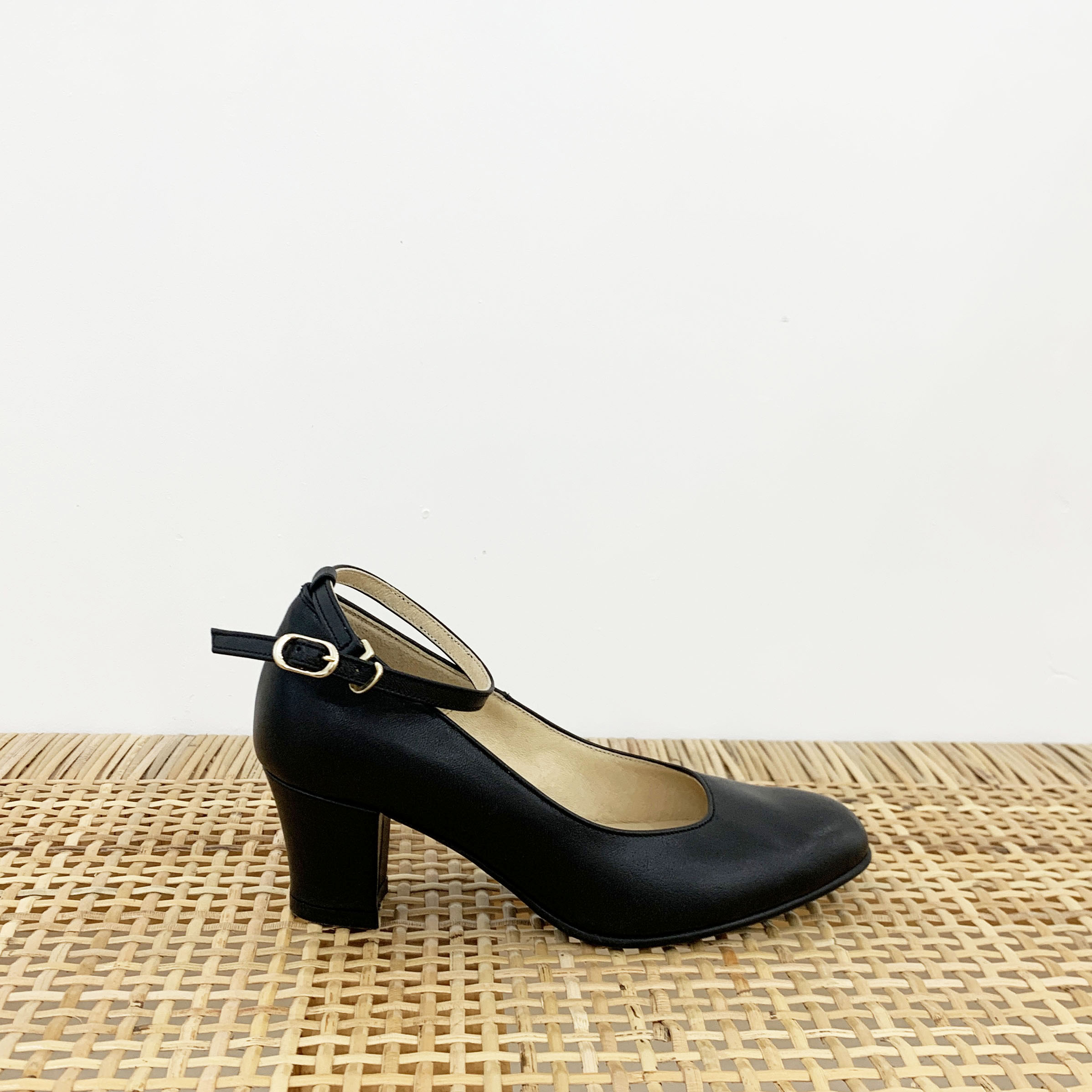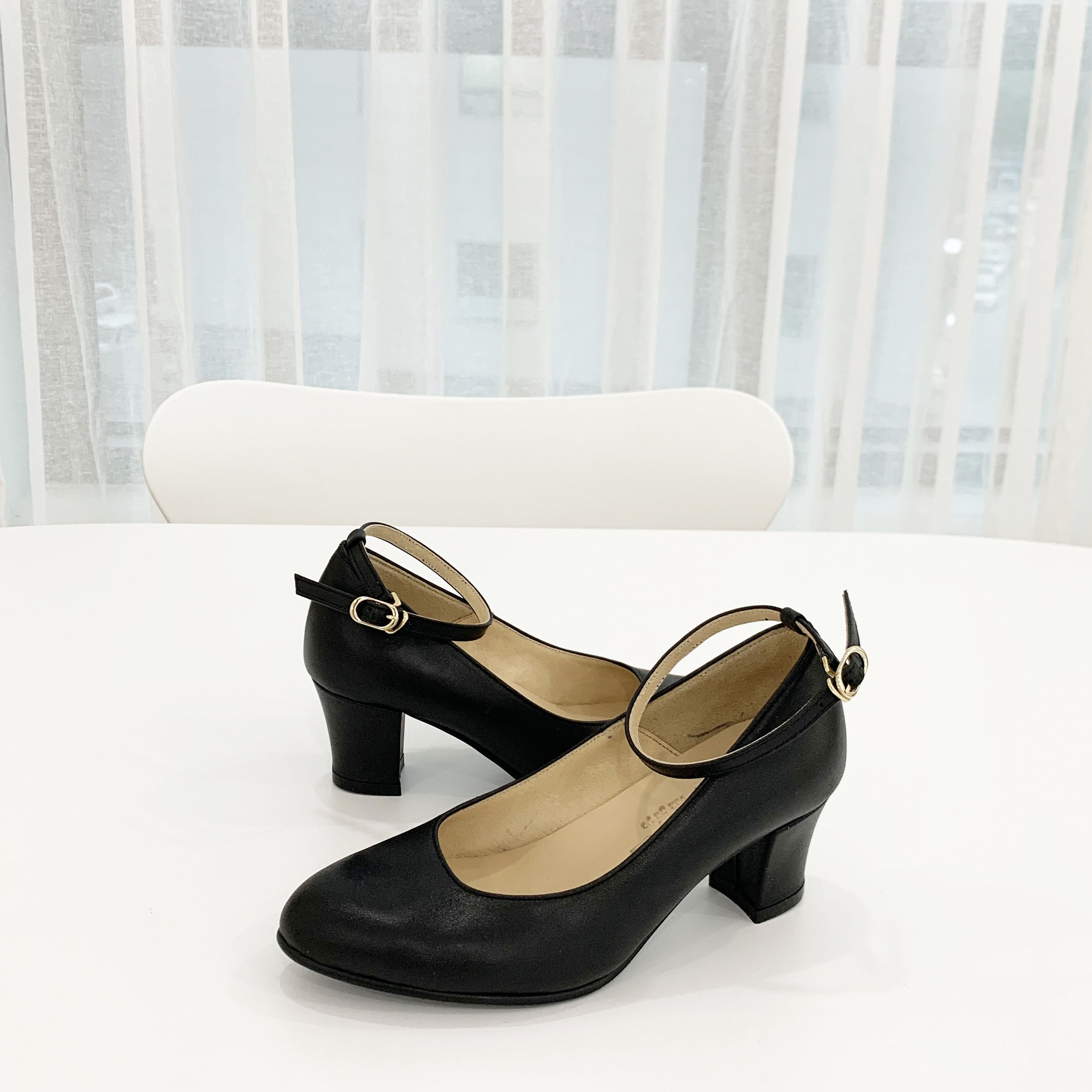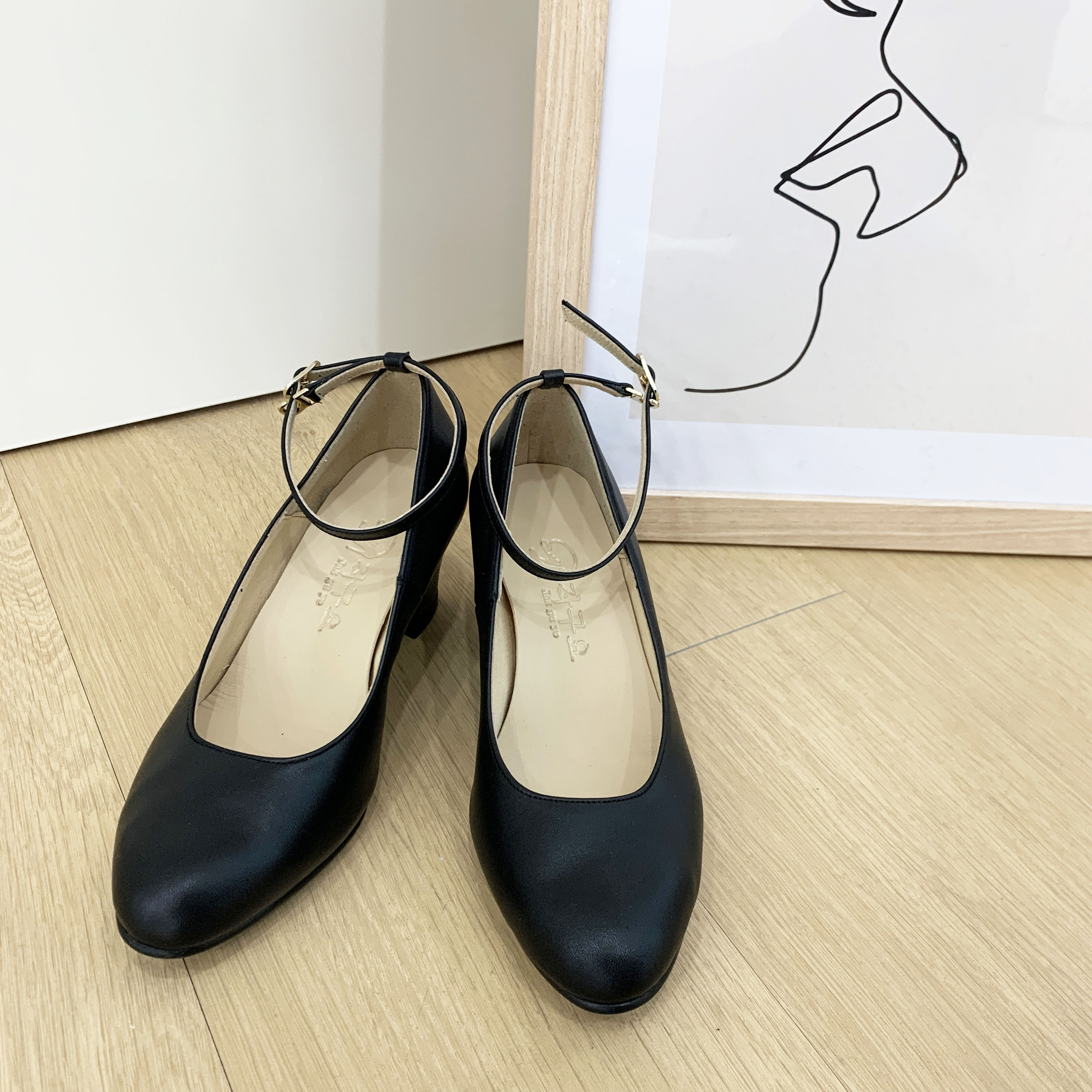 작구요 소가죽 검정 스트랩 인스퀘어 펌프스 힐 5cm