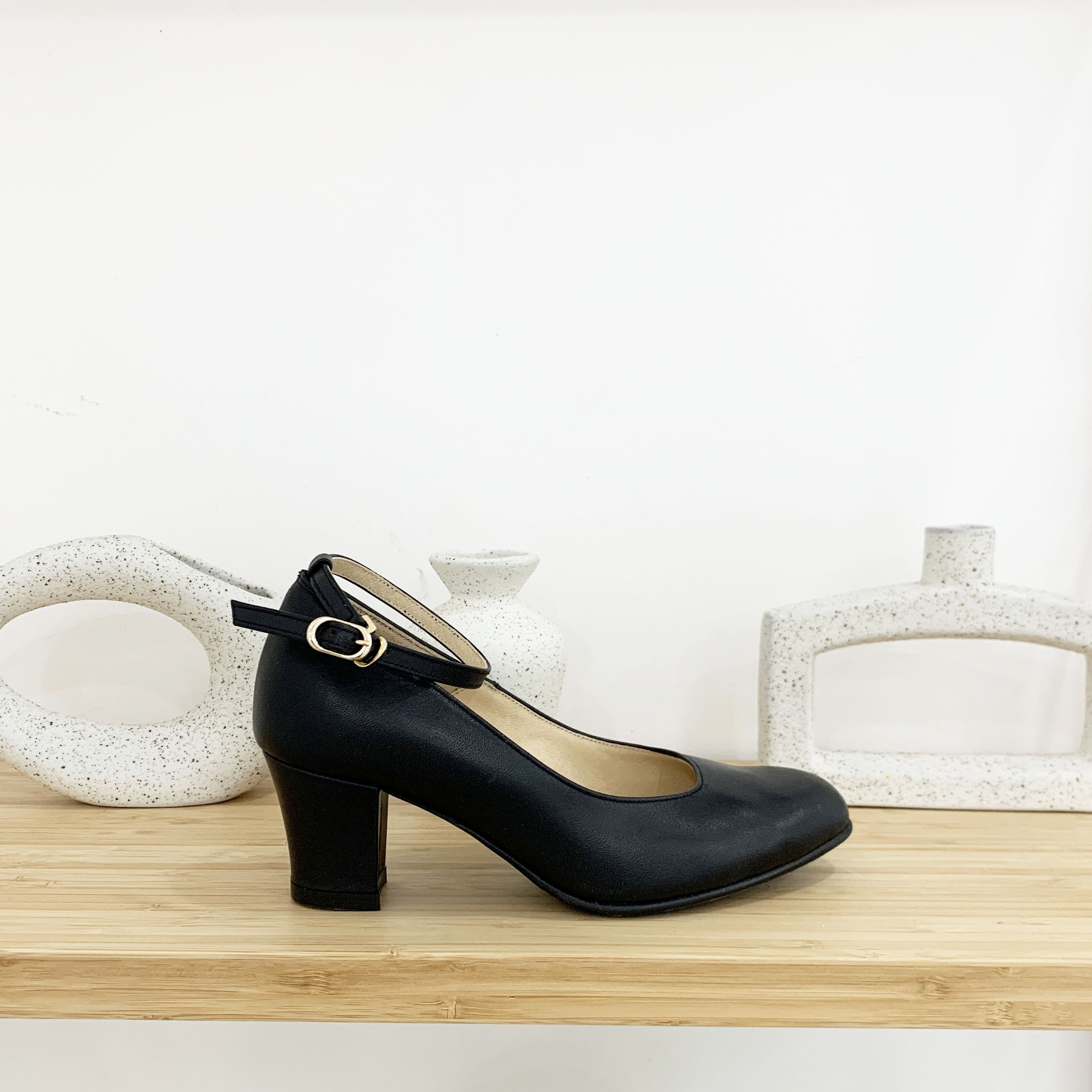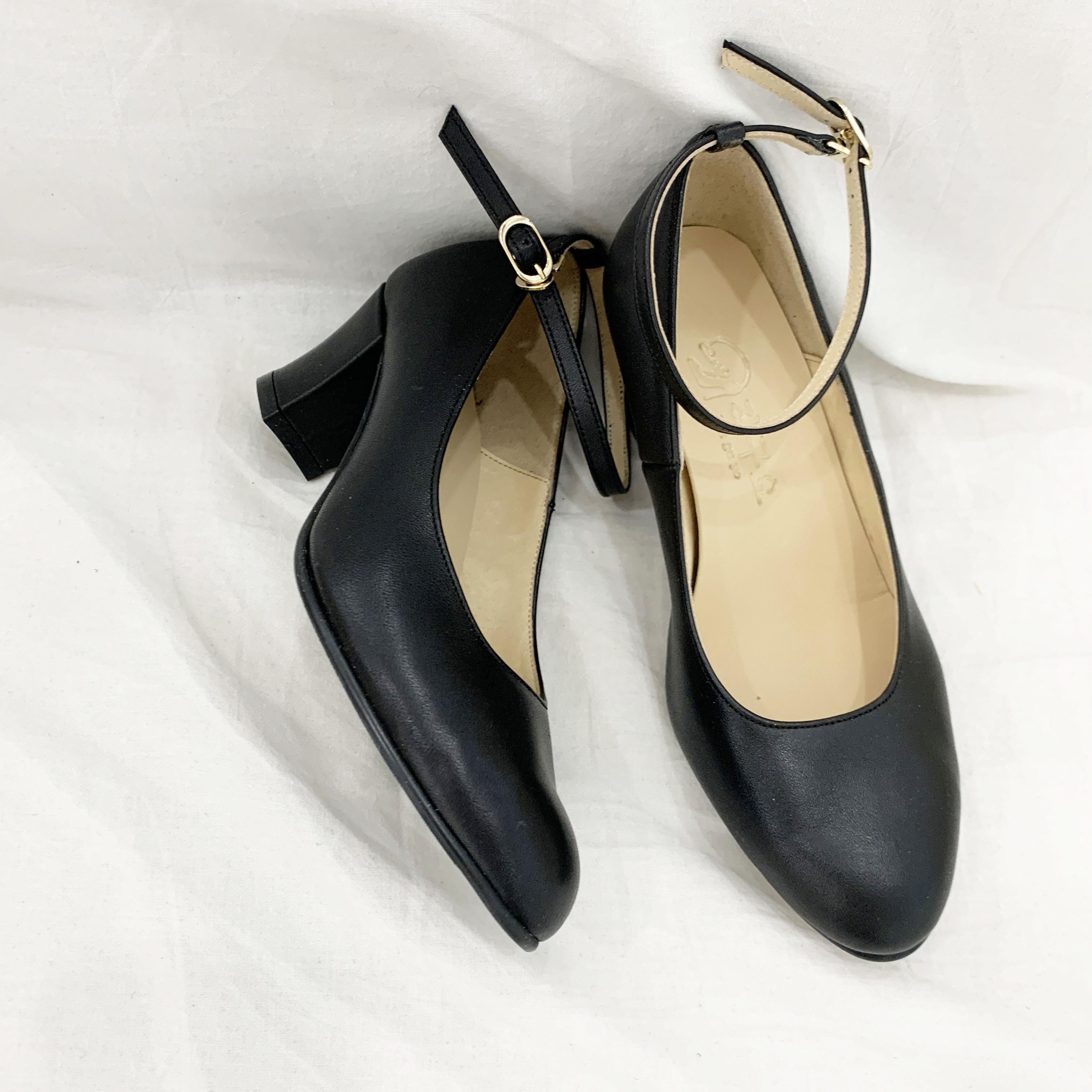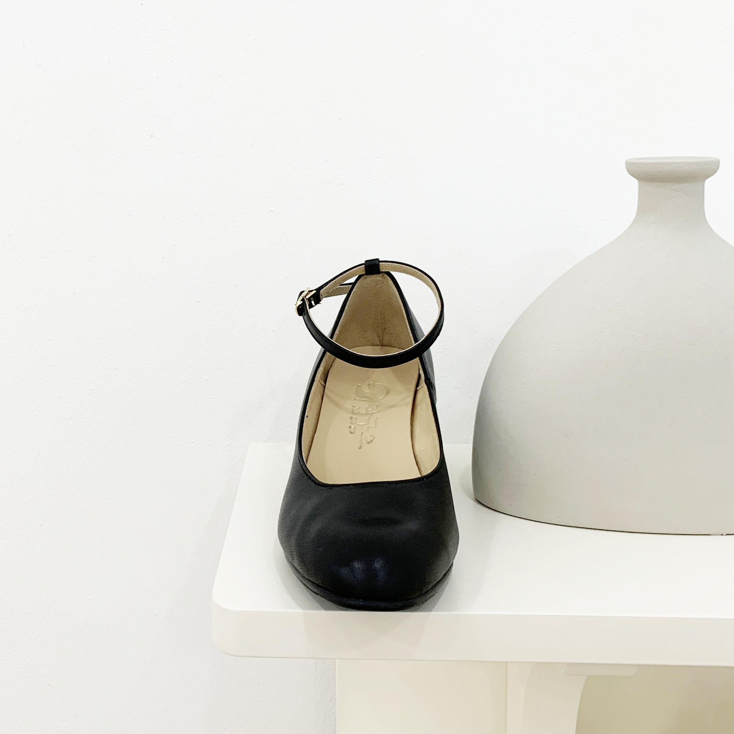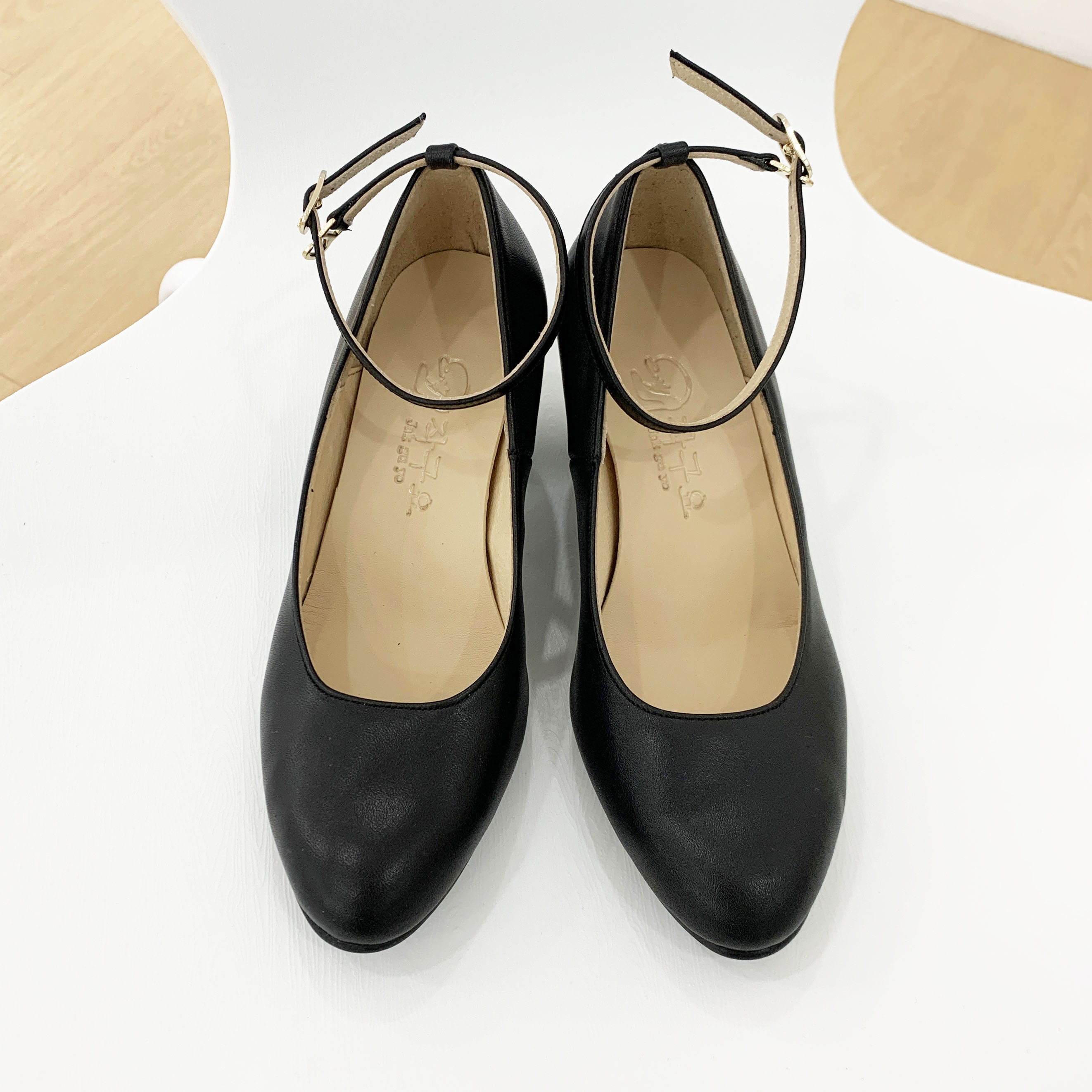 작구요 소가죽 검정 스트랩 인스퀘어 펌프스 힐 5cm
