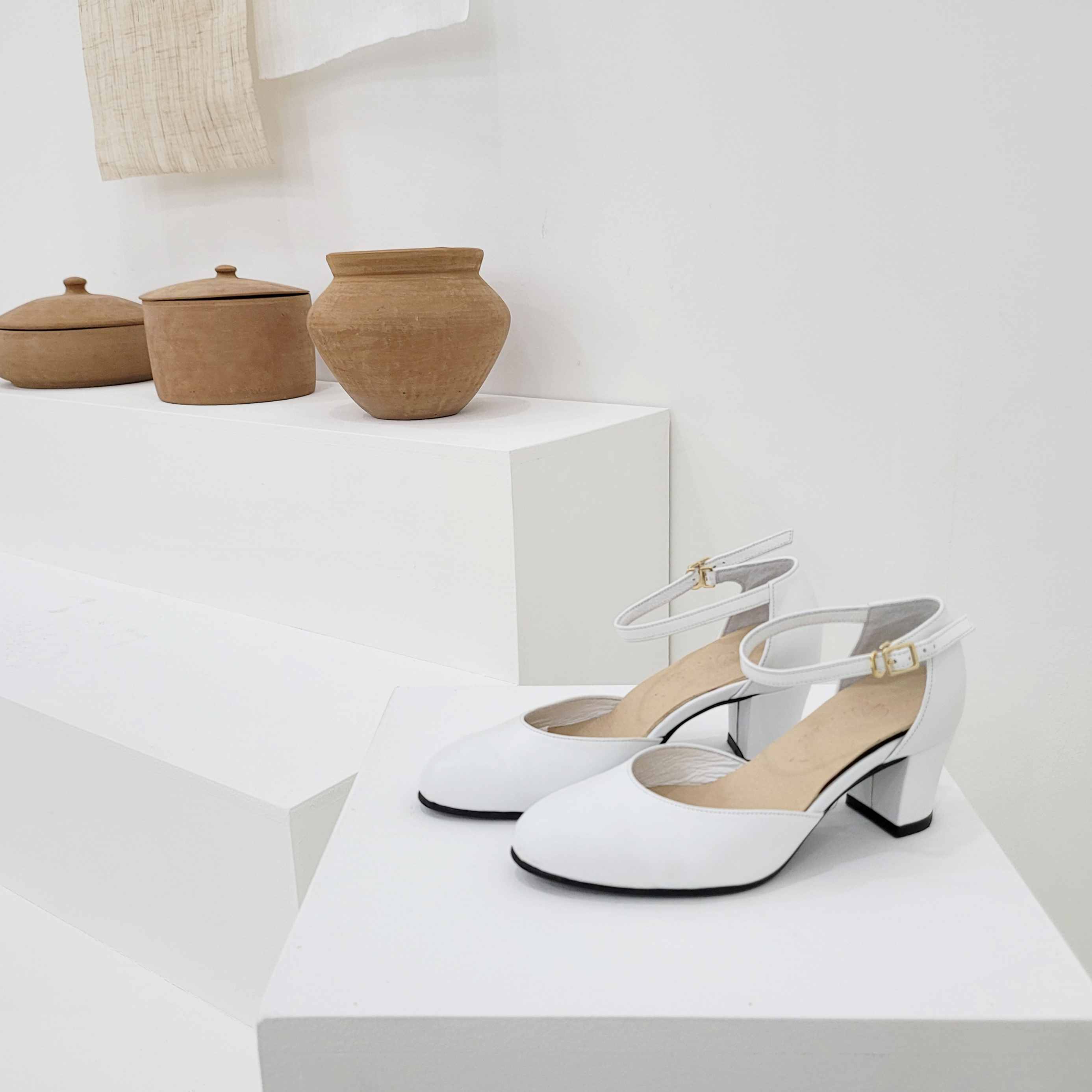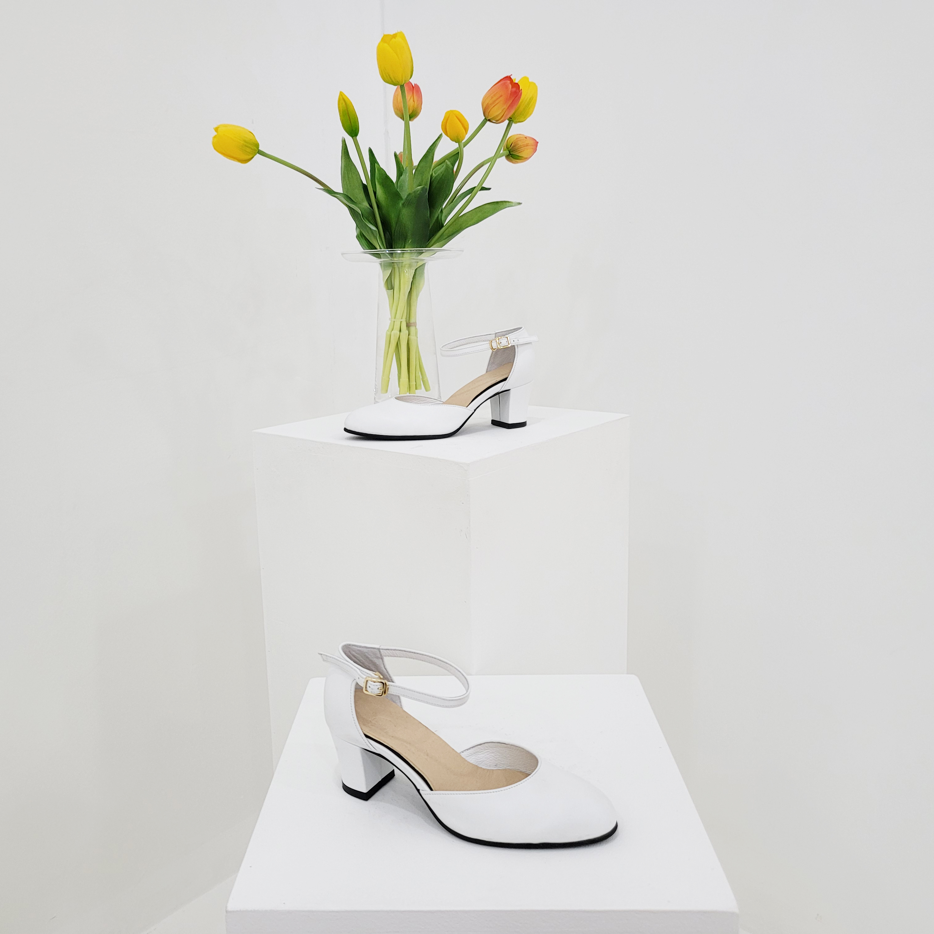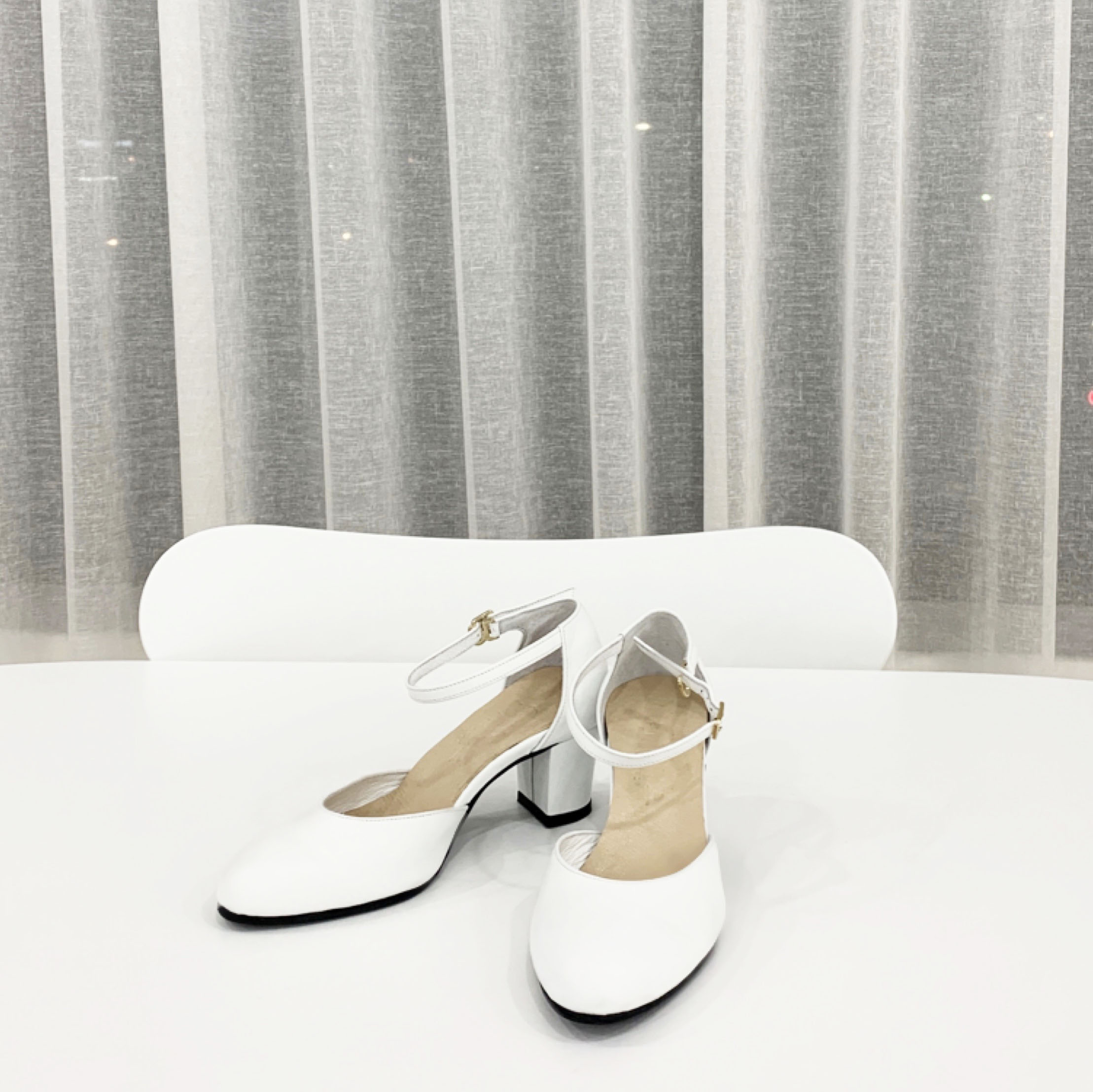 작구요 소가죽 흰색 앵클 스트랩 인라운드 오픈사이드 5cm