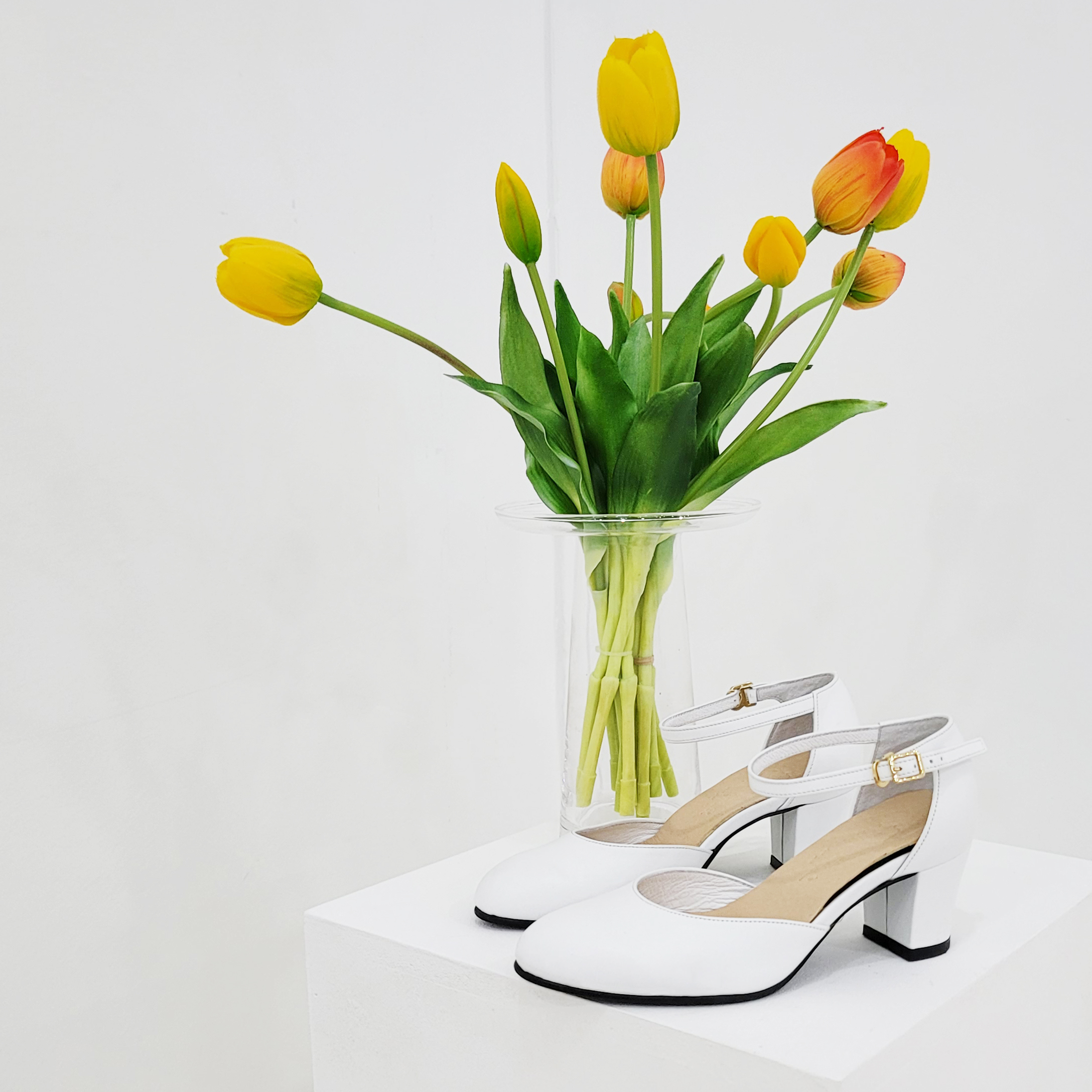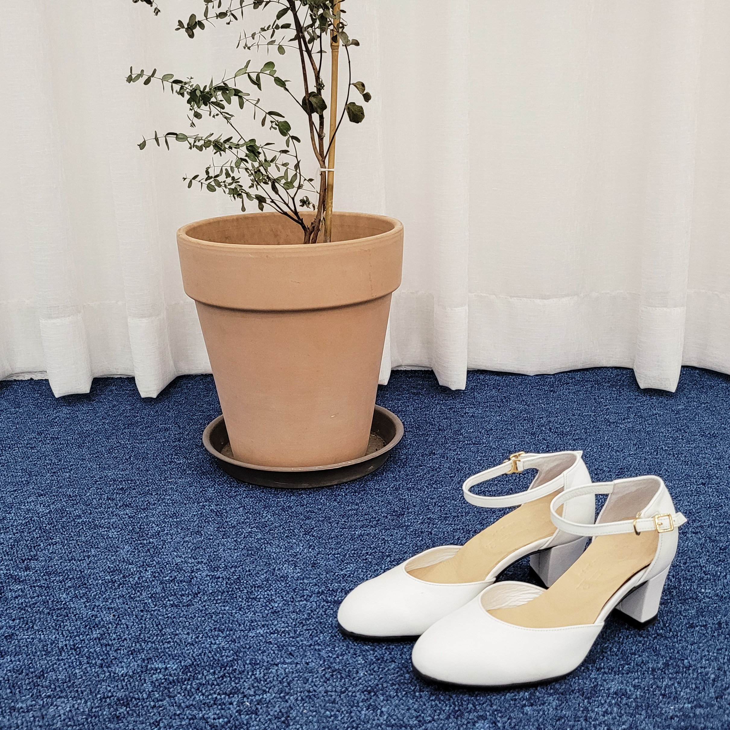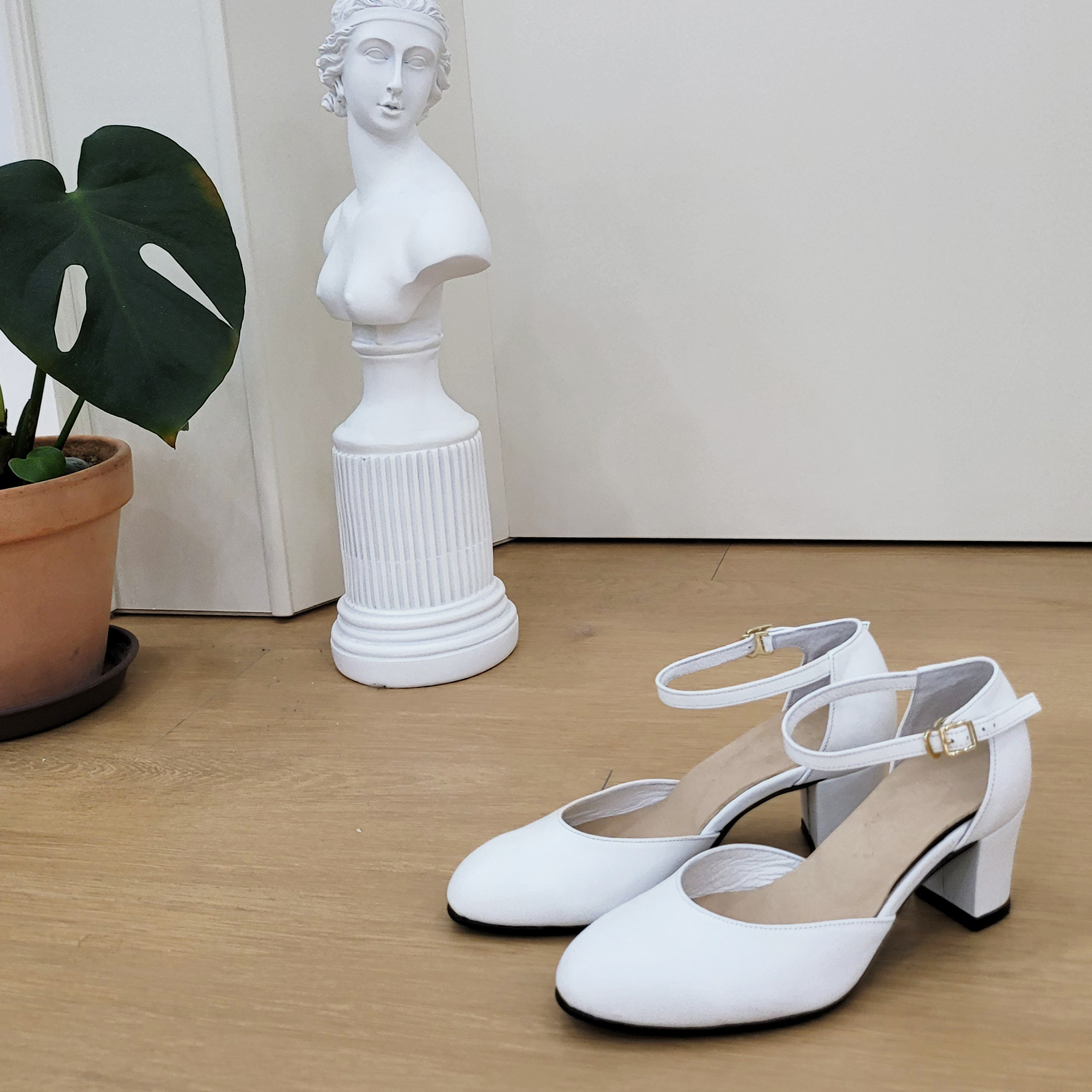 작구요 소가죽 흰색 앵클 스트랩 인라운드 오픈사이드 5cm