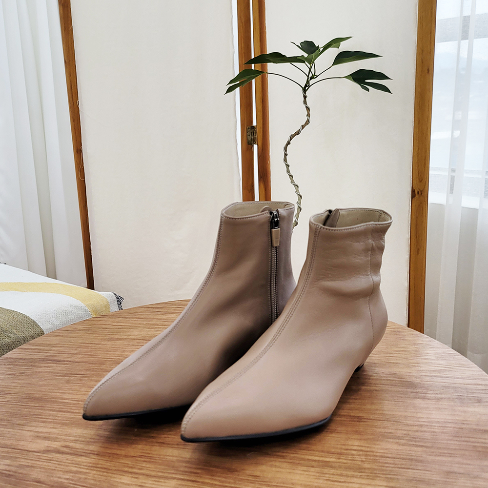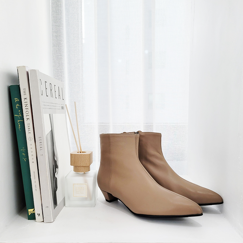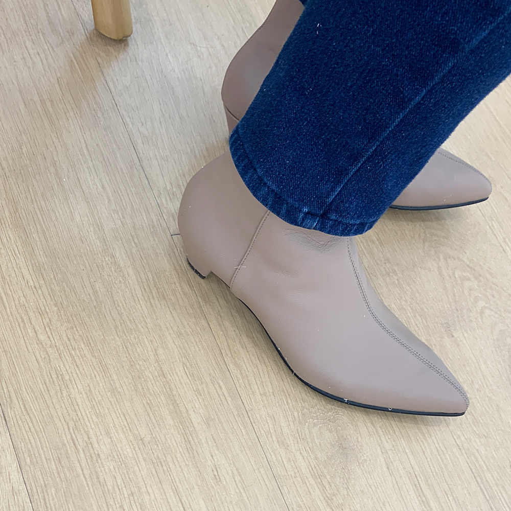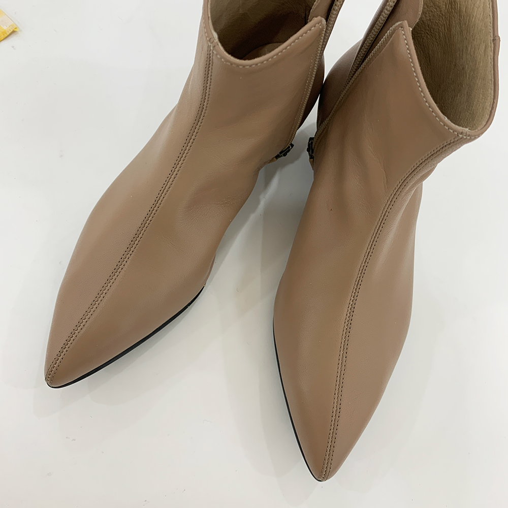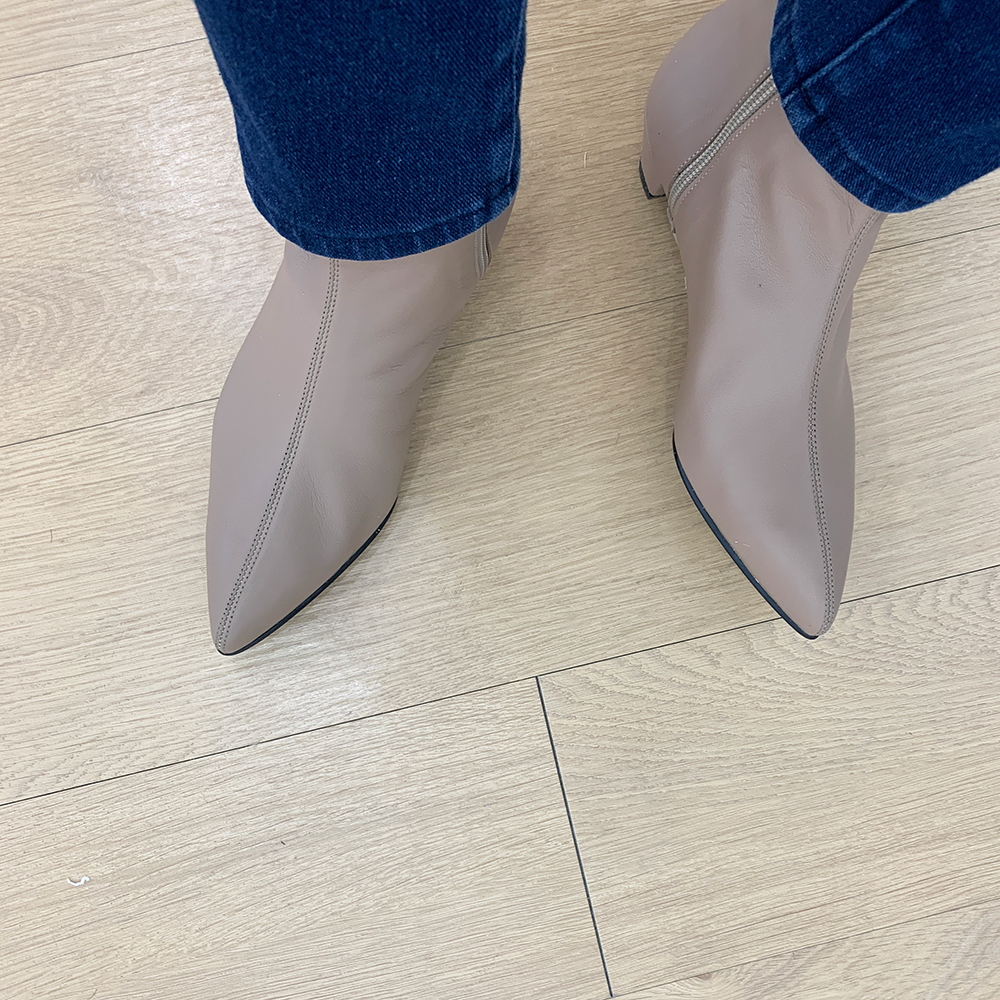 작구요 모카베이지 양가죽 뾰족코 하이 앵클부츠 3cm